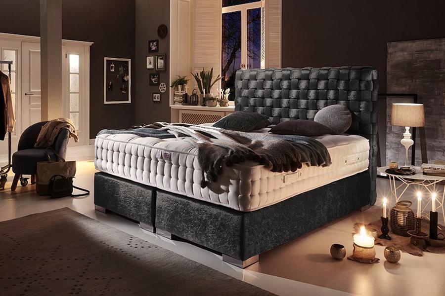 The headboard made in countless hours of manual labor interacts with the perfectly intertwined and accented with beautiful color gradients of fabric almost like a three-dimensional painting. An absolute eye-catcher in your bedroom.