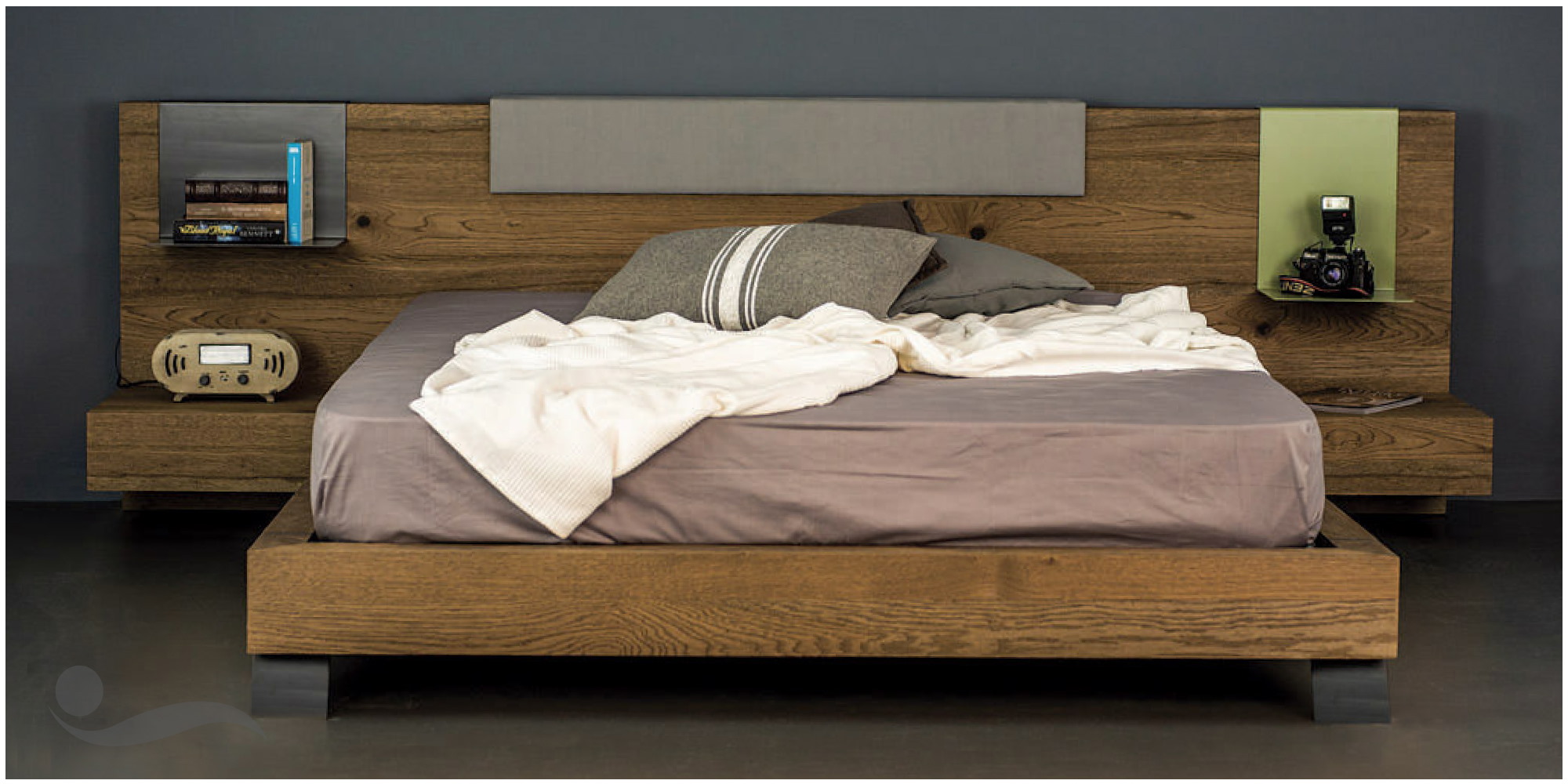 Το μεγάλων διαστάσεων κεφαλάρι που συνδυάζει το ξύλο με το ύφασμα και τους πρακτικούς μεταλλικούς σερβιτόρους μας δίνει την αίσθηση ενός μοντέλου με σύγχρονο ύφος.