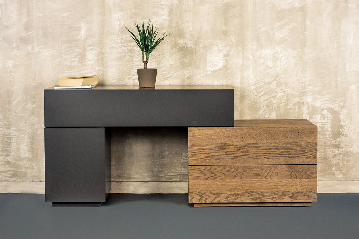 Ξύλο δρυς ρουστικ σε συνδυασμό με ματ λάκα και μεταλλικά στοιχεία.