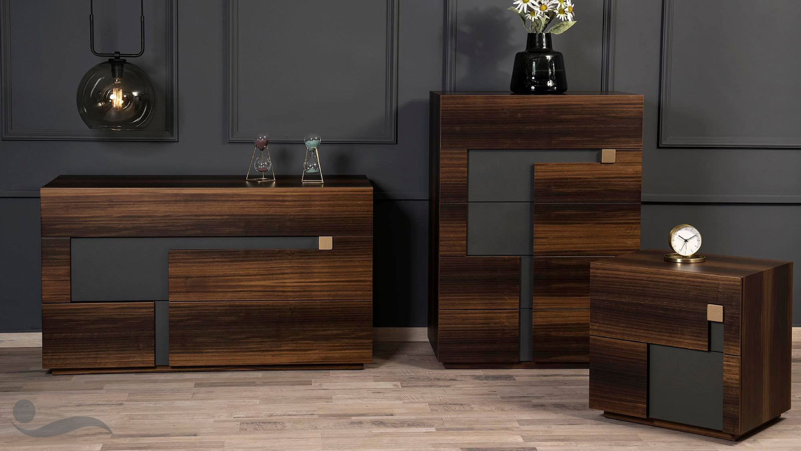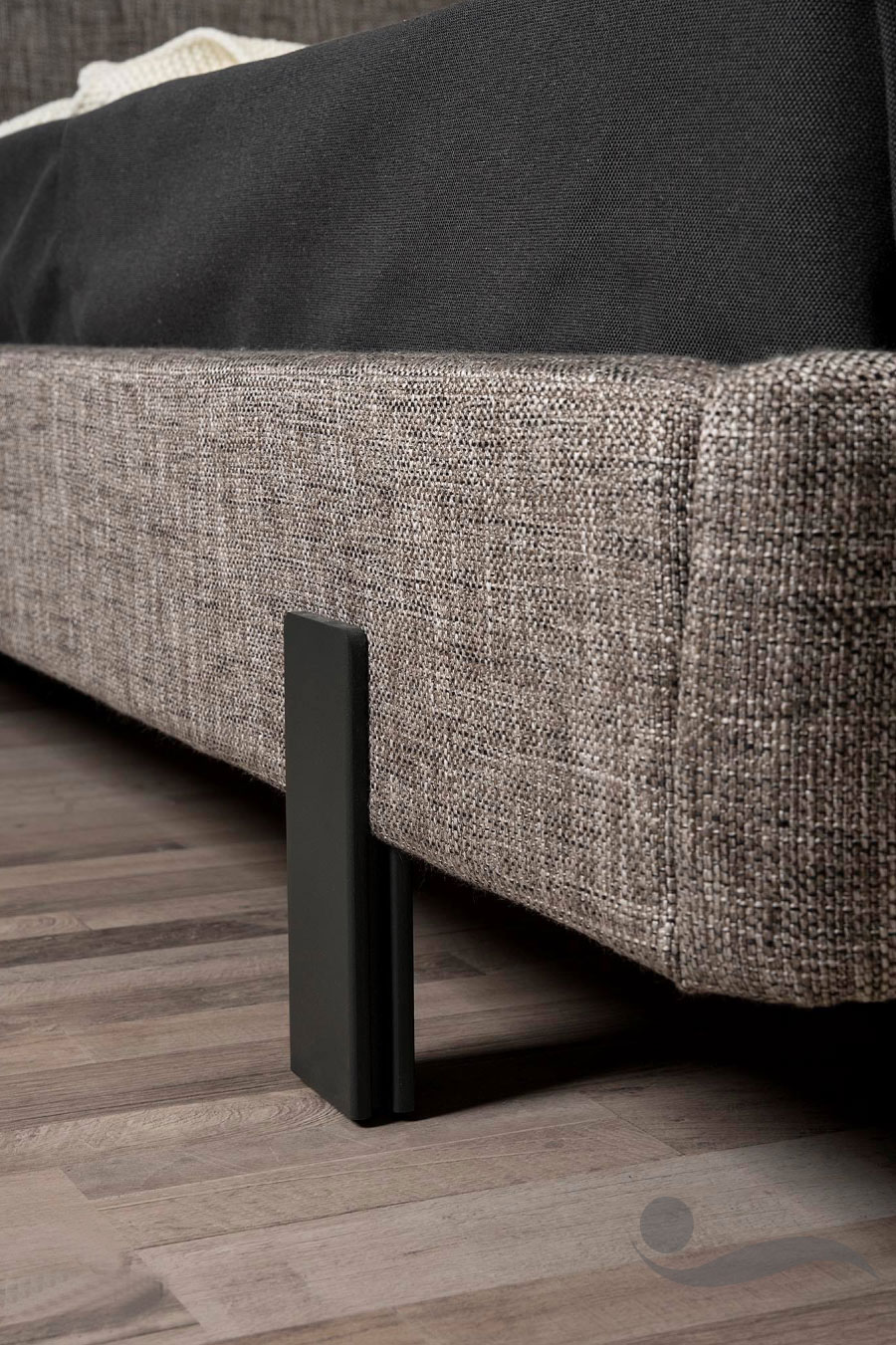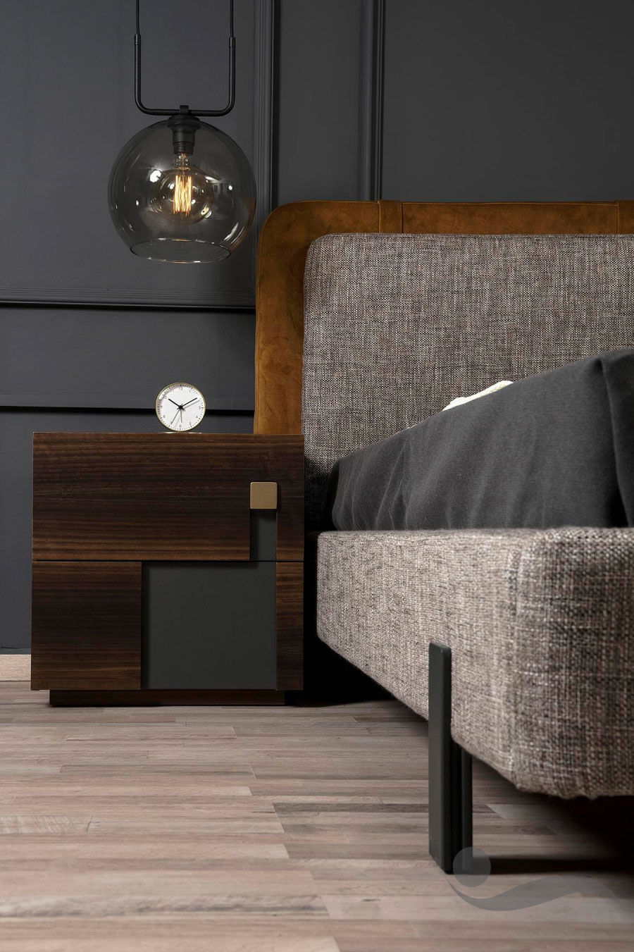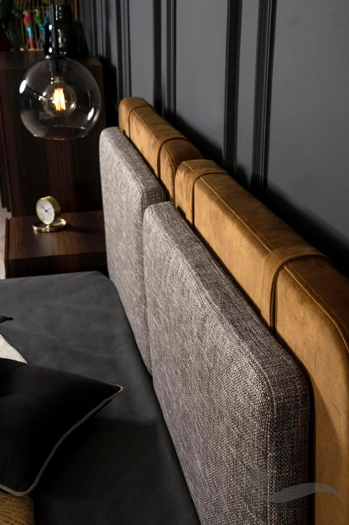 Χαρακτηριστική λεπτομέρεια στην ταπετσαρία του κρεβατιού είναι ο συνδυασμός των χρωμάτων του υφάσματος που δένουν αρμονικά με την υπόλοιπη κατασκευασμένη από Ευκάλυπτο κρεβατοκάμαρα.