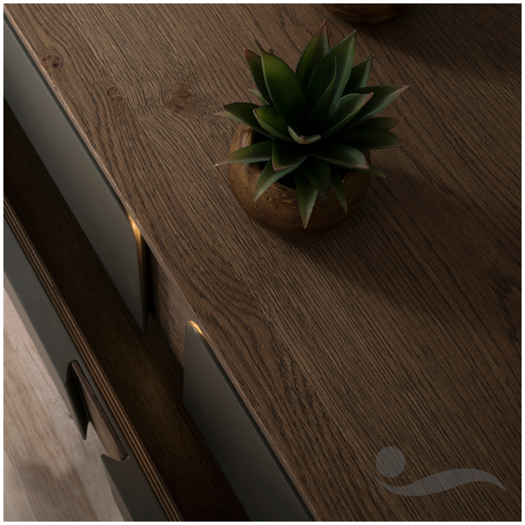 Ξύλο δρυς ρουστικ σε συνδυασμό με ματ λάκα και τεχνόδερμα.